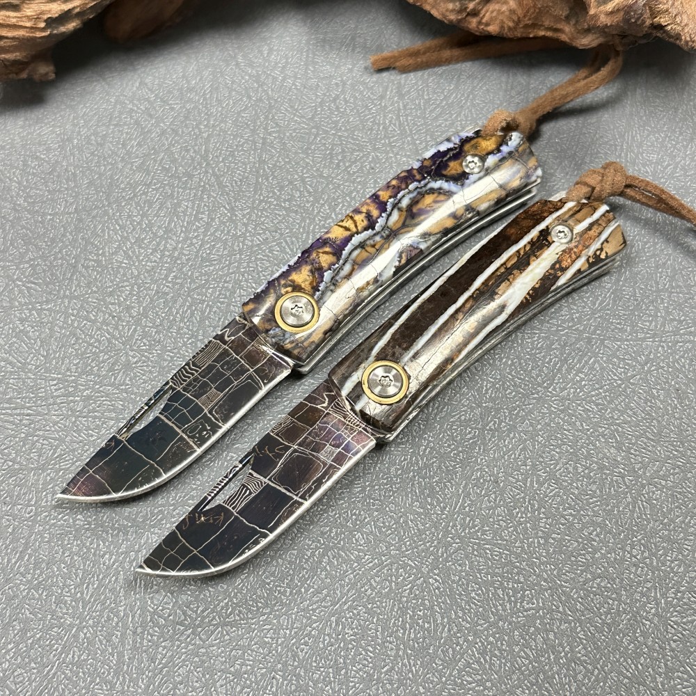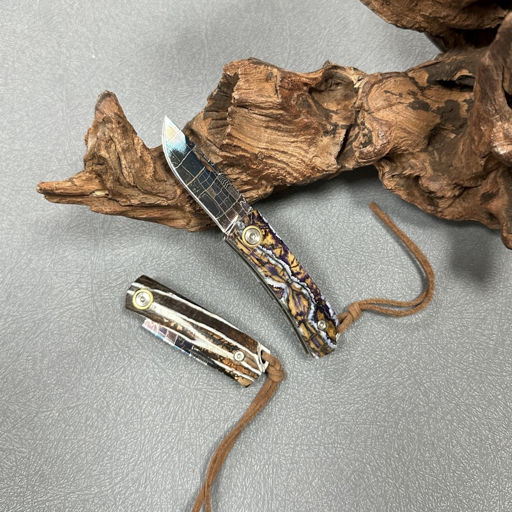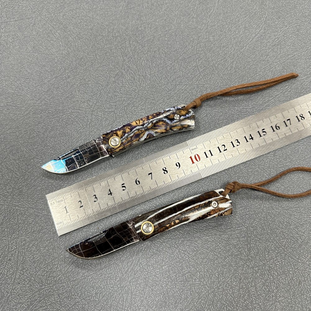 Head out camping? Grab our Damascus Folding Knife, flip it open, and that blued Damascus blade cuts through peaches or kindling like a dream—no fussy, fragile nonsense. Back home, set it on your desk? That mammoth molar handle steals the show! Carved from ancient fossils, here’s the kicker: every time we make one, the world loses one more unique piece—no two are even close. Way cooler than those same-old mass-produced knives, right?