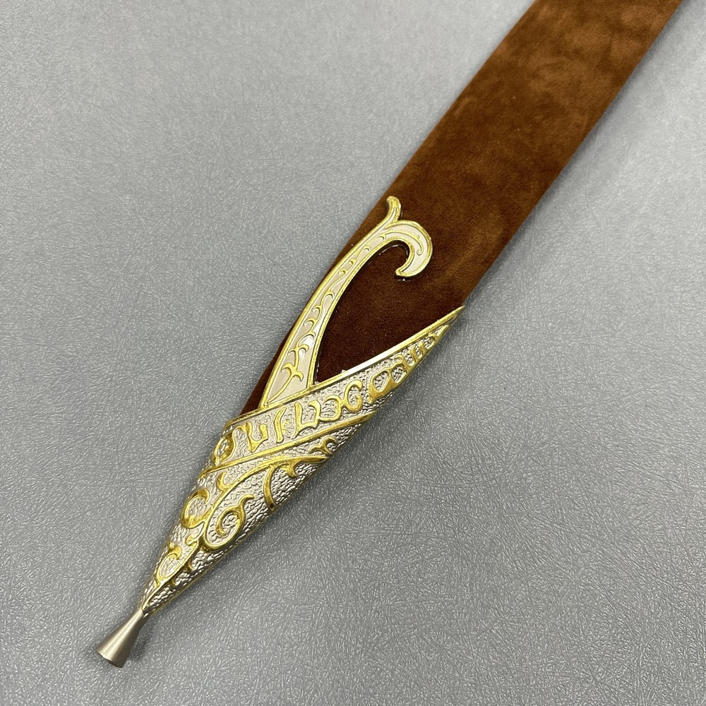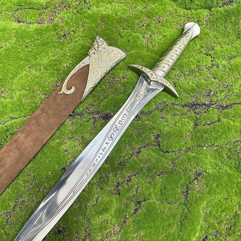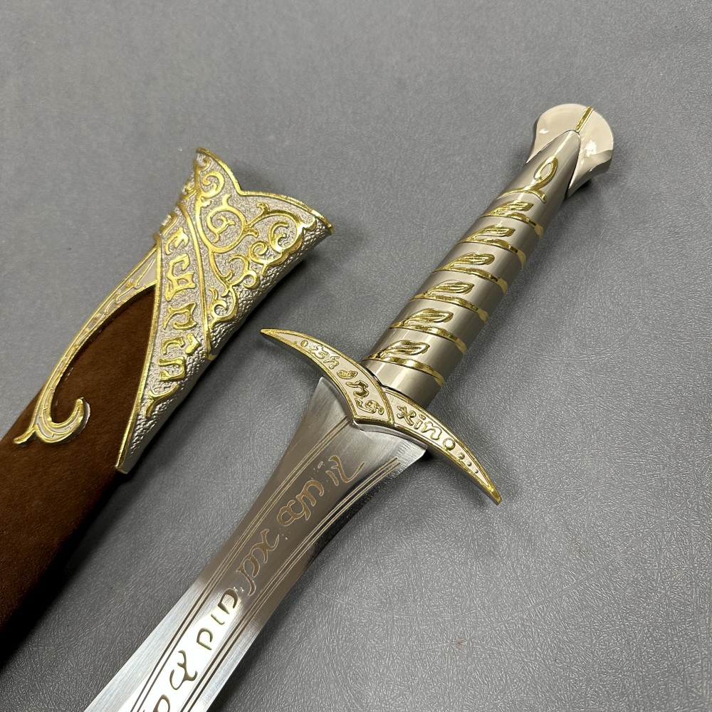 Sting is an Elven short sword forged in Gondolin during the First Age. Originally discovered by Bilbo Baggins in a troll hoard, it became the perfect weapon for a Hobbit on the Quest for Erebor. Bilbo later had the blade engraved in Sindarin with “Maegnas aen estar nin dagnir in yngyl im,” meaning, “Sting is my name, I am the spider’s bane.” The sword was later carried by Frodo Baggins and Samwise Gamgee throughout the events of The Lord of the Rings. Known for its sharp, piercing design—reflected in the Sindarin root maeg—Sting famously glows blue in the presence of orcs or goblins.